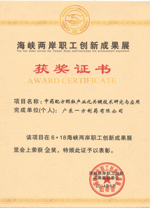 我司工會(huì )主席吳文攜公司的“中藥配方顆粒產(chǎn)業(yè)化關(guān)鍵技術(shù)研究并應用”項目參加了本次展覽,并榮獲“6?18海峽兩岸職工創(chuàng )新成果展”金獎獎牌。