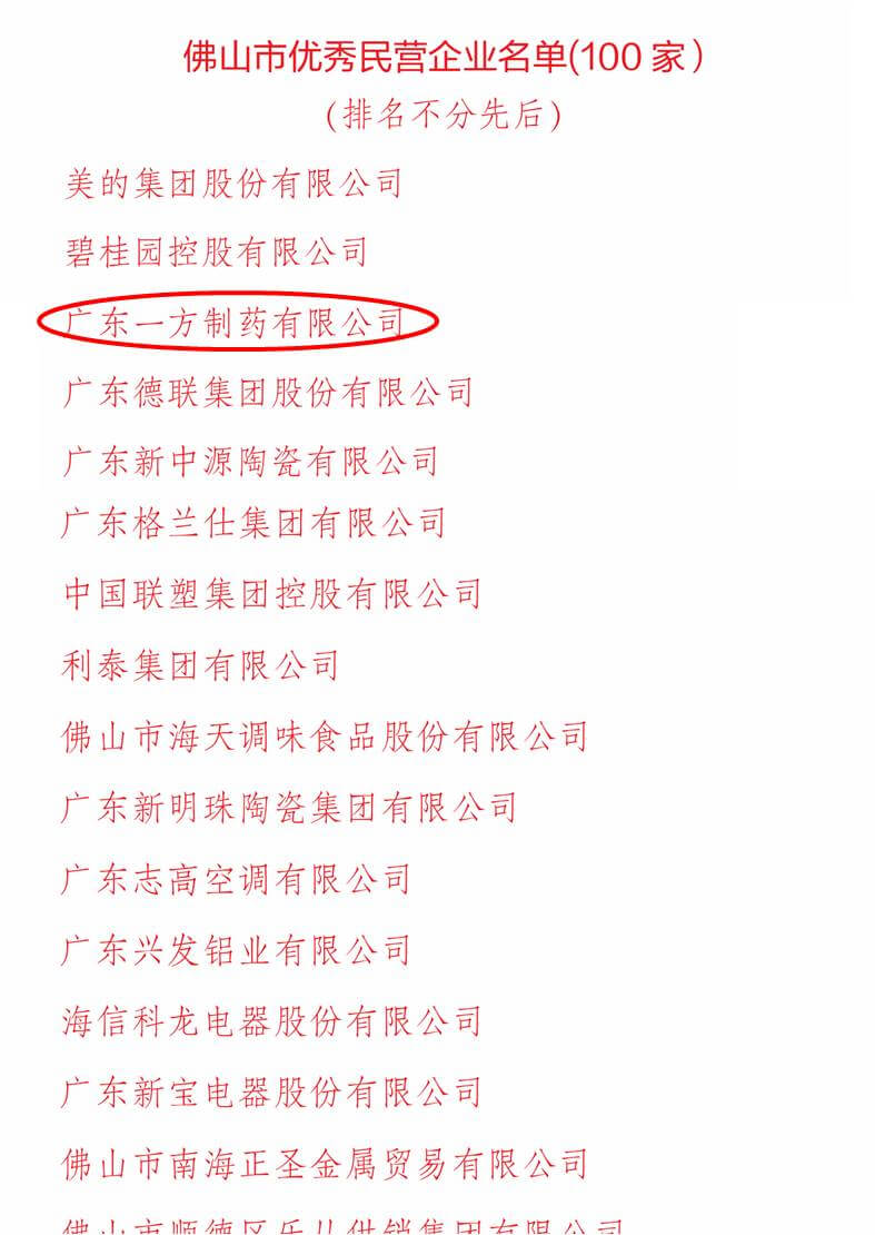 10月12日,佛山市工商聯(lián)對外正式發(fā)布2016年佛山民營(yíng)經(jīng)濟發(fā)展成績(jì)單,同時(shí)對一批表現突出的佛山市優(yōu)秀民營(yíng)企業(yè)進(jìn)行表彰。其中,廣東一方制藥有限公司憑借多年來(lái)持續優(yōu)異的市場(chǎng)表現以及穩健經(jīng)營(yíng),強勢入圍佛山優(yōu)秀民營(yíng)企業(yè)百強榜單,成為在經(jīng)濟新常態(tài)下在智能制造、提質(zhì)增效、科技創(chuàng )新等方面的標桿。