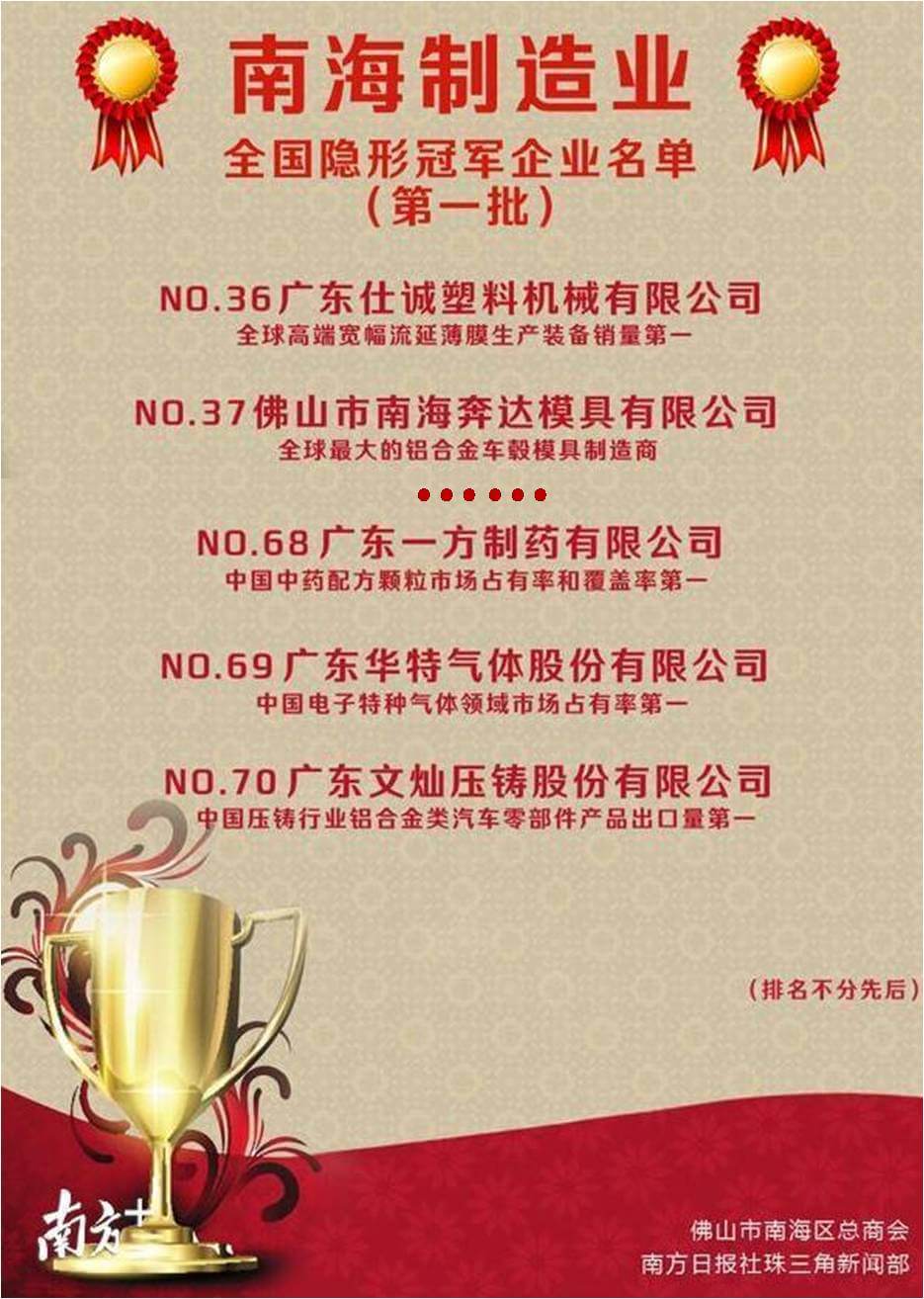 12月5日上午,佛山市南海區舉行品牌企業(yè)行動(dòng)計劃發(fā)布暨南海制造業(yè)全國隱形冠軍授牌大會(huì )。大會(huì )公布南海制造業(yè)全國隱形冠軍名單并授牌,成立南海制造業(yè)全國隱形冠軍聯(lián)盟。中國中藥·一方制藥自1992年創(chuàng )建以來(lái),秉承“良藥配方,關(guān)愛(ài)健康”的理念,一直致力于推動(dòng)中藥現代化,并在行業(yè)首創(chuàng )智能化藥房,帶動(dòng)了傳統中醫藥行業(yè)與互聯(lián)網(wǎng)智能時(shí)代的融合,引領(lǐng)中藥制藥企業(yè)新一輪的產(chǎn)業(yè)升級,成為了目前中國中藥配方顆粒市場(chǎng)占有率和覆蓋率第一的冠軍企業(yè)。