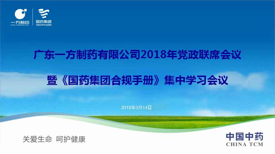 3月14日,一方制藥組織召開(kāi)黨政聯(lián)席會(huì )議,傳達學(xué)習國藥集團2018年工作會(huì )、中國中藥有限公司2017年度工作會(huì )議等上級領(lǐng)導講話(huà)精神,并集中學(xué)習《國藥集團合規手冊》。會(huì )議由公司黨總支部書(shū)記、總經(jīng)理程學(xué)仁主持。公司副總經(jīng)理魏梅,黨總支部副書(shū)記、財務(wù)總監沈斌斌,全體黨員、經(jīng)理級以上管理人員和團組織書(shū)記共七十余人參加會(huì )議。