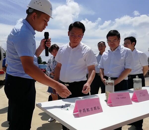江西一方天江常務(wù)副總經(jīng)理藍勇鎧向劉建洋市長(cháng)一行詳細匯報了產(chǎn)業(yè)園項目建設進(jìn)展情況,并現場(chǎng)展示了產(chǎn)業(yè)園未來(lái)生產(chǎn)經(jīng)營(yíng)的中藥材、中藥飲片及中藥配方顆粒的代表產(chǎn)品。
