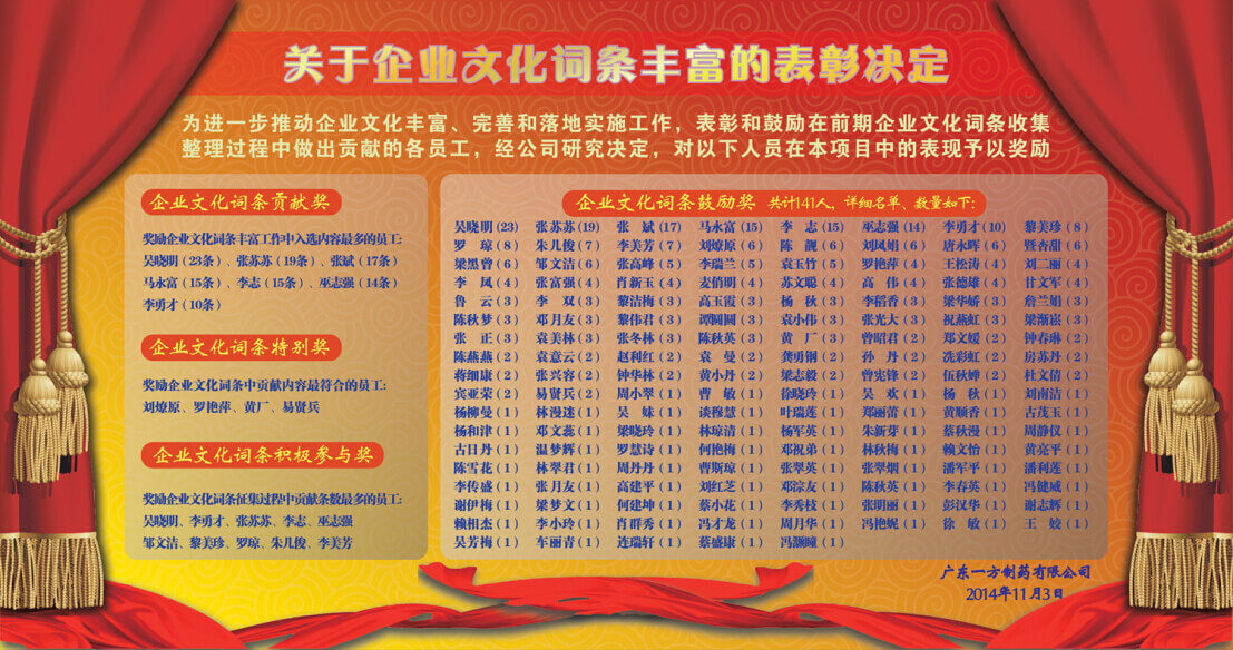 DYNAMIC INFORMATION為進(jìn)一步推動(dòng)企業(yè)文化豐富、完善和落地實(shí)施工作,表彰和鼓勵在前期企業(yè)文化詞條收集整理過(guò)程中做出貢獻的各員工,近日,公司在多媒體會(huì )議廳召開(kāi)了企業(yè)文化詞條表彰大會(huì ),公司各級主管人員和員工代表共同參加了本次活動(dòng)。公司品牌部相關(guān)人員就企業(yè)文化詞條征集活動(dòng)過(guò)程進(jìn)行了總結,對最終形成的結果進(jìn)行了匯報,常務(wù)副總經(jīng)理程學(xué)仁先生就一方制藥新時(shí)期的企業(yè)文化內涵,用生動(dòng)樸實(shí)的語(yǔ)言進(jìn)行了詳細的闡述,指出了在新階段公司的遠景目標和企業(yè)核心經(jīng)營(yíng)理念,以及合格員工應當倡導和遵循的行為準則。程總指出,希望這份由全公司同仁共同征集研討的企業(yè)文化能夠真正深入每一位一方人內心,成為推動(dòng)一方制藥朝著(zhù)百年企業(yè),百億元企業(yè)的強大動(dòng)力。