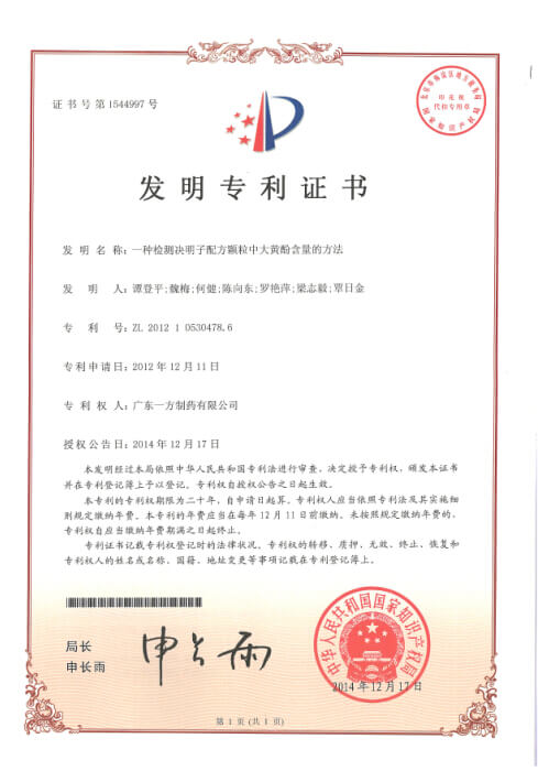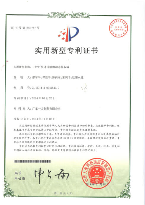 DYNAMIC INFORMATION近期,國家知識產(chǎn)權局發(fā)文公告授權我公司4項專(zhuān)利,其分別為兩項發(fā)明專(zhuān)利“一種檢測決明子配方顆粒中大黃酚含量的方法”和“一種改善中藥配方顆粒噴霧干燥工藝的輔料組合及其應用”,實(shí)用新型專(zhuān)利“一種可快速排液的動(dòng)態(tài)提取罐”,外觀(guān)專(zhuān)利“包裝盒(中藥配方顆粒)”。2014年至今,我公司圍繞中藥配方顆粒產(chǎn)業(yè)化研究及相關(guān)產(chǎn)業(yè)研究,累計獲得發(fā)明專(zhuān)利授權3項,實(shí)用新型1項,外觀(guān)專(zhuān)利1項。相關(guān)成果的應用與保護,將為一方制藥進(jìn)一步推進(jìn)中藥配方顆粒全面產(chǎn)業(yè)化,促進(jìn)企業(yè)跨越發(fā)展,成就國內中藥配方顆粒領(lǐng)導者奠定堅實(shí)的基礎。